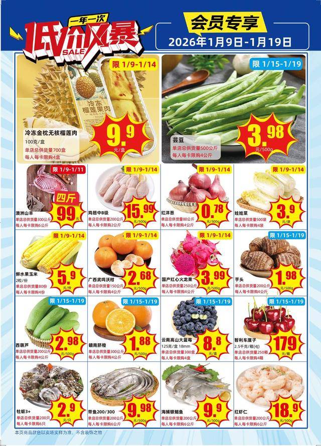 应季蔬果的低价直供,让“菜篮子”拎得更轻快。大润发此次聚焦“鲜”与“省”,冷冻金枕无核榴莲肉仅9.9元/盒,让榴莲爱好者实现“自由”;广西武鸣沃柑2.68元/500g、赣南脐橙1.88元/500g,酸甜多汁的柑橘类水果成为冬日补水首选;云南高山大蓝莓8.8元/盒、智利4J车厘子(2.5千克/箱)179元/箱,高端水果也放下“身段”。就连家常配菜如西葫芦2.98元/500g、红洋葱0.78元/500g,都以“地板价”守护烟火气,让每一餐都新鲜又划算。